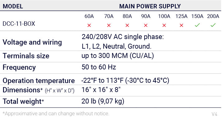 The DCC-11-BOX can be powered by a 120/240-208V AC single phase source, max 200A.