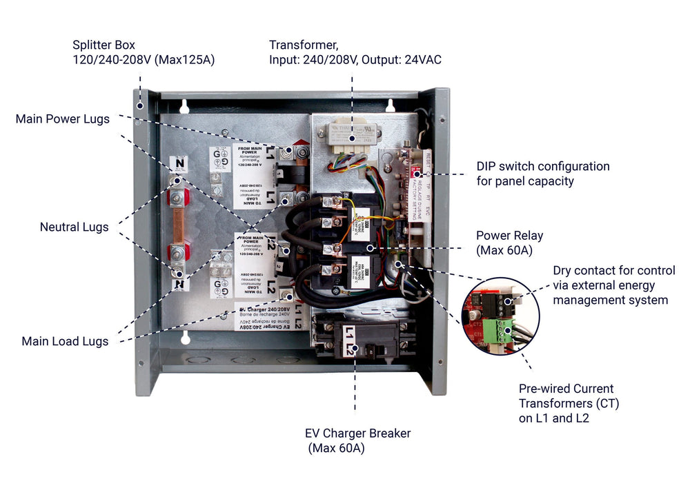 - Detects when the total power consumption exceeds 80% of a main circuit breaker capacity and temporarily de-energizes the charger